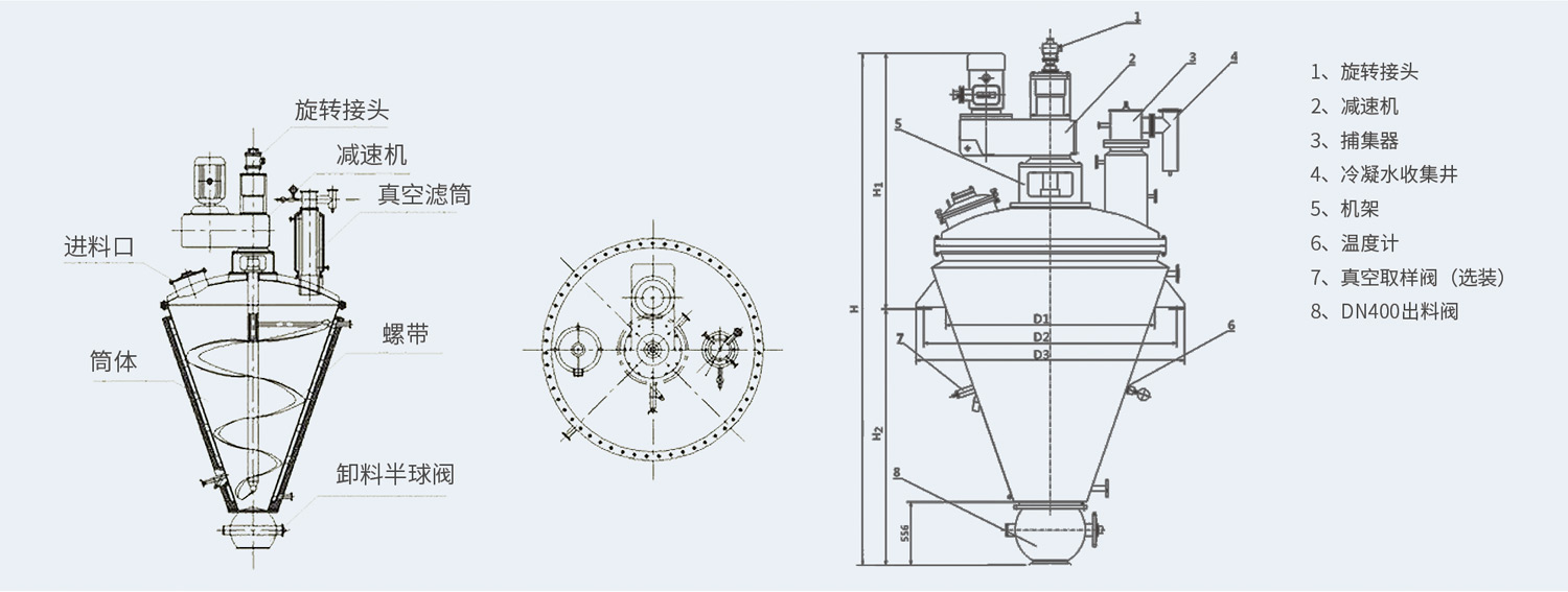 利用攪拌螺帶將物料旋轉(zhuǎn)提升,錐形夾套內(nèi)同時(shí)通入傳熱介質(zhì),如熱水、導(dǎo)熱油、蒸汽等,使加熱后的物料從四周提升并從中間下落,快速不斷的循環(huán)翻轉(zhuǎn),并通過(guò)載氣將濕份及時(shí)帶走,使物料達(dá)到干燥和混合目的。并且在筒體內(nèi)無(wú)任何傳動(dòng)機(jī)構(gòu),…